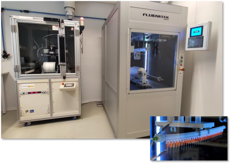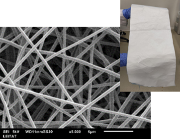 Equipos de electrospinning disponibles en las instalaciones de Leitat y ejemplo de mat nanofibroso producido.
